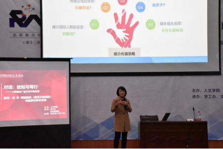 12月15日下午,人文学院在图书馆报告厅举办了出彩新青年论坛第十讲《对话:致知与笃行--大数据在广告行业的应用》。此讲邀请了网联数科电视事业部总经理中国杰出经理人徐珍女士作为主讲嘉宾。人文学院党总支书记宣王威,党总支副书记石科,文化传媒系主任李巧苗,文化传媒系教师代表学工办教师代表以及广告学专业18级、专升本19级及20级各年级同学230余人参加了本次活动