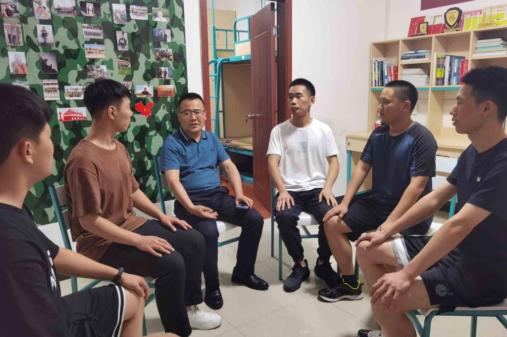 在退伍军人特色寝室,潘国忠和同学们亲切交谈,详细询问他们部队、学习、生活等情况,鼓励同学们不忘初心,传承部队里的优良作风,将学习与党史相结合,把党史学习成果体现在学习生活中,做到退伍不褪色、退役不退志。