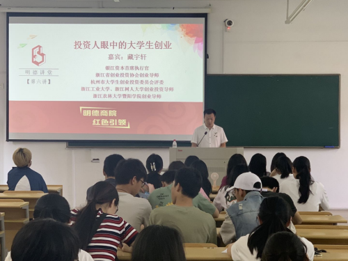 “明德讲堂”是商学院“明德商院 红色引领1+1”党建工作品牌系列子活动之一,旨在通过高水平的专家讲座提升商院师生理论武装,实现思想引领。6月24日下午,商学院在人文3323教室举办了明德讲堂(第六讲),邀请银江资本首席执行官、浙江省创业投资协会创业导师、杭州市大学生创业投资委员会评委、浙江工业大学和浙江树人大学创业投资导师、bat365在线中国官网登录入口创业导师藏宇轩作为主讲嘉宾讲授《投资人眼中的大学生创业》,讲座由商学院党总支副书记徐定高主持,商学院近百名师生参加了本次活动。