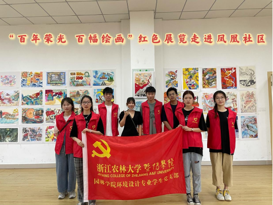 活动前期,环境设计专业学生党支部的党员同志们提前将“百年荣光 百幅绘画”绘画带到现场进行布置。这次活动同学们们为小朋友精心挑选了100幅优秀作品进行展示,绘画作品内容丰富,形式多样,风格相异,各有千秋。党员及入党积极分子还协助社区工作人员整理气球等物品,精心准备着明天的游园会。