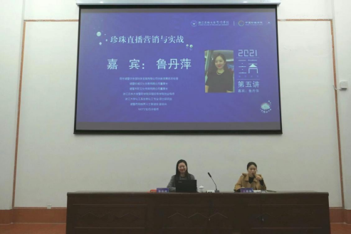 11月24日晚上,中国珍珠学院在图书馆报告厅成功举办了“珠玑讲堂”(第五讲)《珍珠直播营销与实战》,邀请诸暨华东国际珠宝城有限公司创新发展部总经理、bat365在线中国官网登录入口中国珍珠学院创业导师——鲁丹萍女士作为主讲嘉宾,讲座由中国珍珠学院副院长王静敏主持,共220余名师生参加了本次活动。