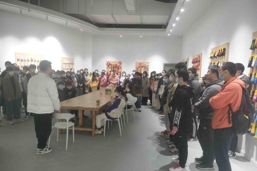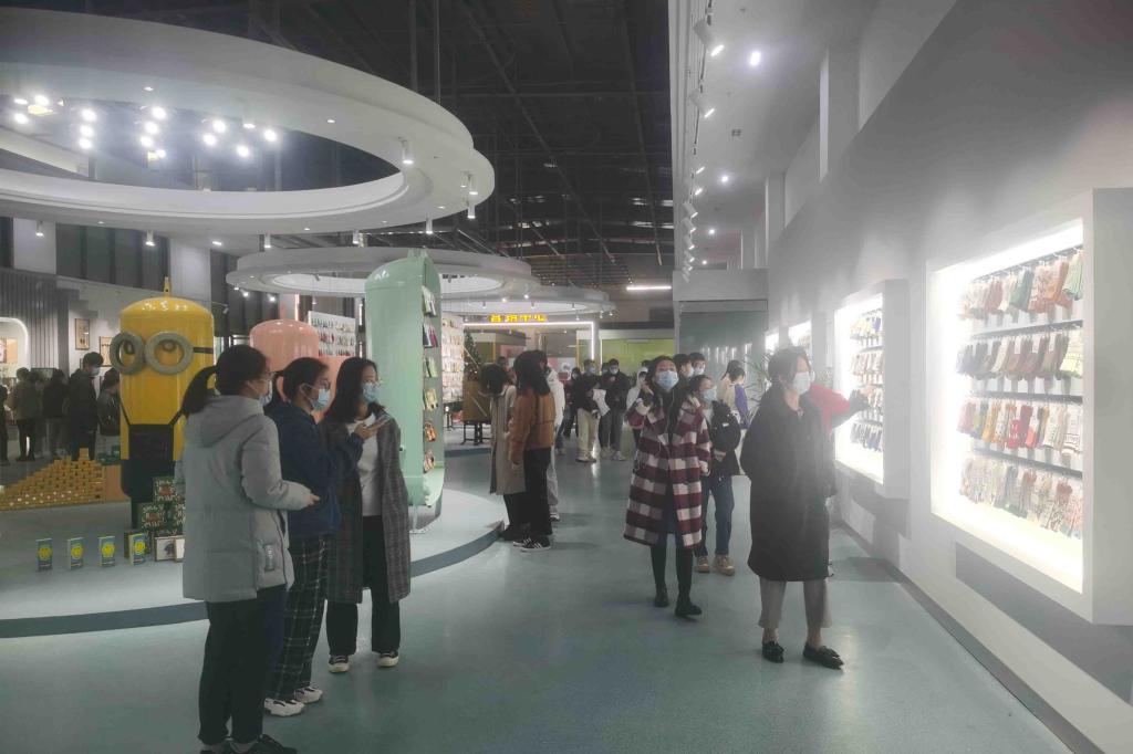 在公司业务责任人的详细介绍下,产业班学生参观了阿大互联科技的袜业博物馆和产品展示厅。一台台早已退休的袜机以及玻璃展柜展示的袜子发展史,让学生感受历史的更迭。一排排一列列袜子风格百变,精美的设计款式,别致的外包装,让学生耳目一新。卡拉美拉的直播基地,独居特色的装修风格吸引了众多学生的眼球,也让学生有了一次实地参观专业直播间的体验。