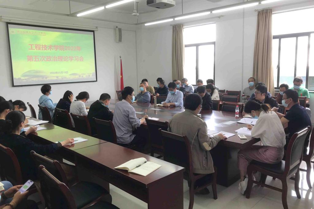 5月19日,工程技术学院在理工3402会议室召开2022年度第五次政治理论学习会,会议由党总支书记周聪主持,全体教职工参加会议。