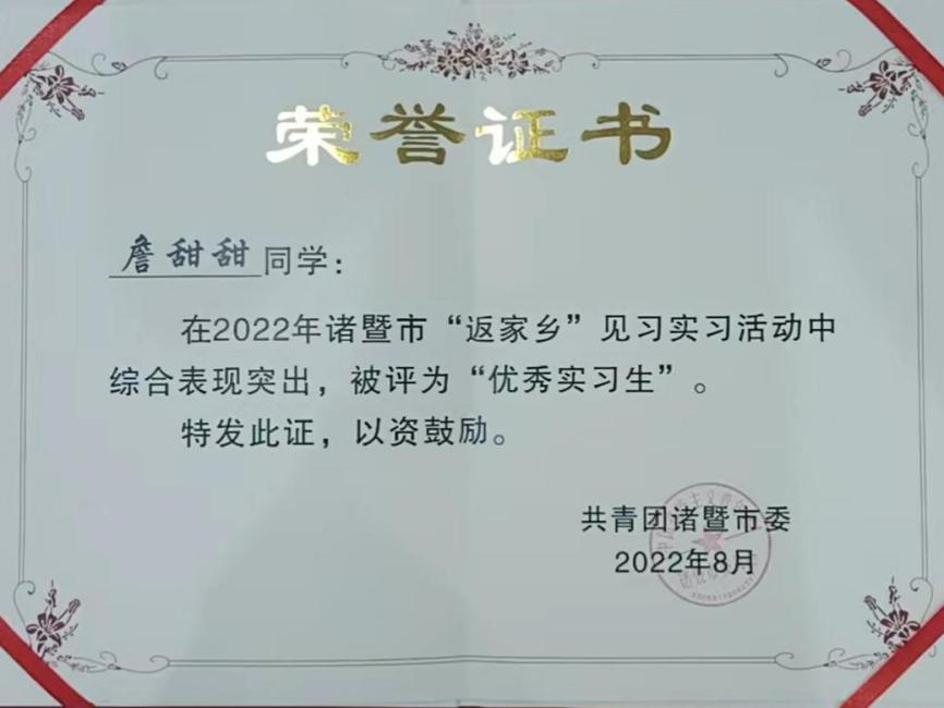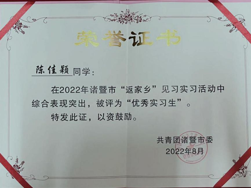 我院学子在共青团诸暨市委2022大学生“返家乡”见习实习中喜获“优秀实习生”