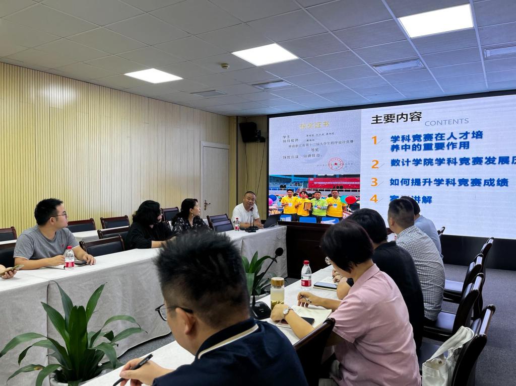 会上,吴达胜教授做题为“如何提升学科竞赛成绩”的报告,从学科竞赛在人才培养过程中的重要作用、数计学院学科竞赛发展历程、案例讲解等不同方面分享了学科竞赛成绩提升经验。他特别指出,要理清综合类、专业类、专业基础类和学科基础类学科竞赛与对学生能力要求之间的关系,促进学科竞赛的可持续发展。