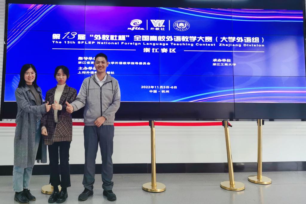 2022年11月5日-6日,第十三届“外教社杯”全国高校外语教学大赛(大学外语组)浙江赛区复赛和决赛在浙江工商大学成功举行。人文学院、马克思主义学院公共外语教师郭晋如、吴浩凭借扎实的专业基本功和出色的教学展示,分获综合课组二等奖、(视)听说课组三等奖。