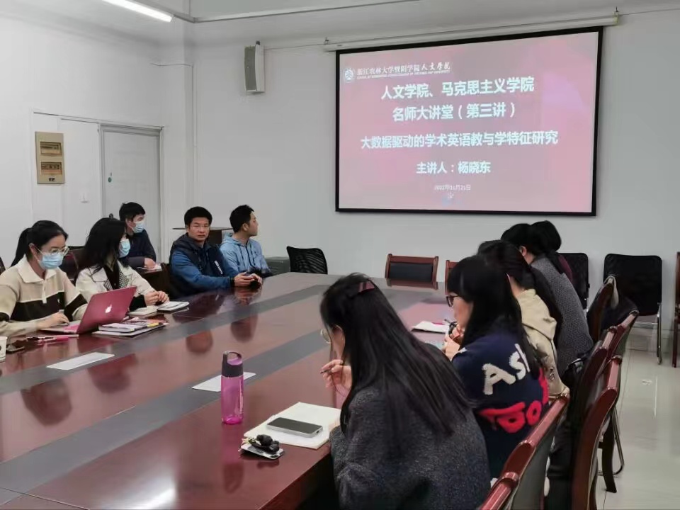 2022年11月21日下午,人文学院、马克思主义学院举行名师大讲堂第三讲《大数据驱动的学术英语教与学:学术文本特定标记的使用特征研究》。本次讲座邀请了浙江工业大学外国语学院副教授,韩国国立忠南大学语言学博士杨晓东作客论坛。本次活动由公外教研部部门负责人孙淑霞主持。人文学院院长刘伯茹出席。公外和英语专业20余位教师参与了讲座和讨论。