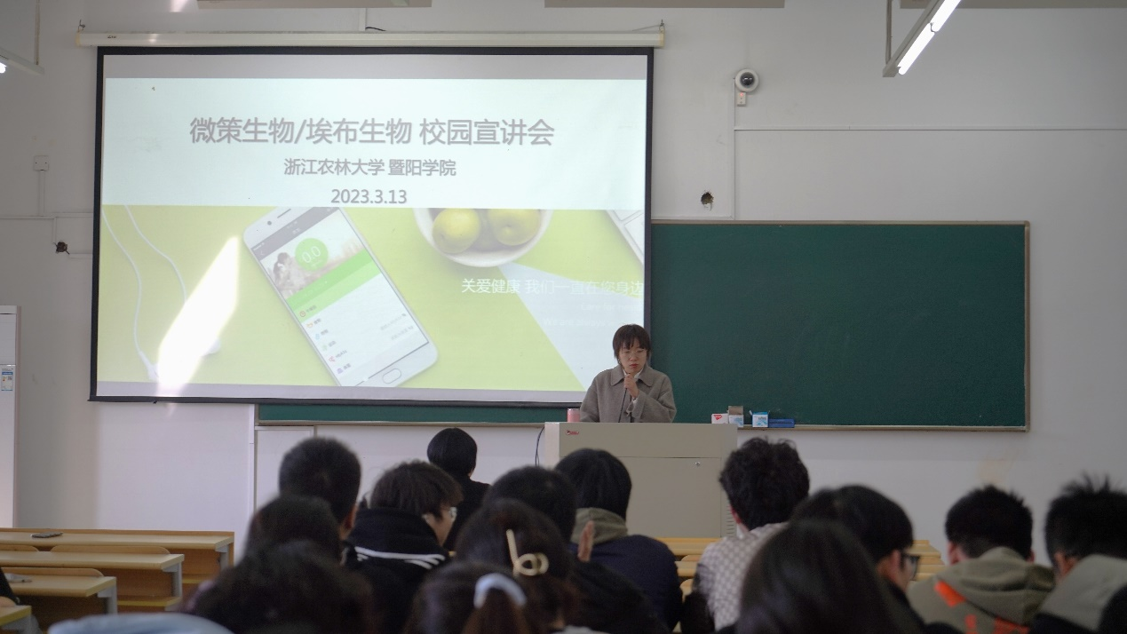 徐奔首先简要介绍了诸暨埃布生物技术有限公司的发展历程、发展定位、行业状况、公司价值观、研发投入和经济效益、公司特色产品、全球营销网络、公司岗位等情况,使同学们对该公司有了初步了解。随后她又详细介绍了公司的薪资待遇、人文环境以及晋升培养体系,不仅能为同学们的专业实习提供良好的平台,也能让同学们对自己所学专业的就业前景和发展方向有了更明确的认知。
