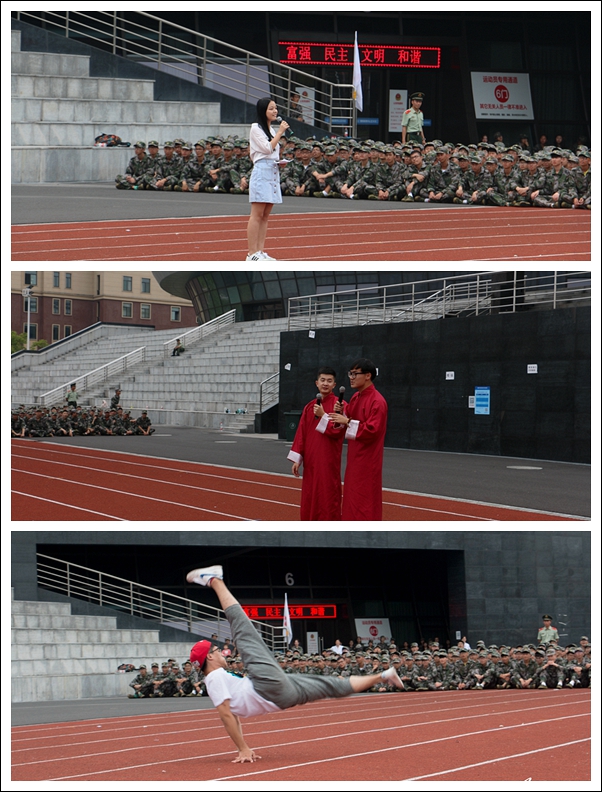 慰问演出以相声、独唱、舞蹈等形式表演。玉玄鸟艺术团三面墙剧社的相声《我的大学》拉开了演出的序幕,各阵营里不时发出欢笑声;声乐队、舞蹈队齐上阵,活力四射的街舞、爵士舞表演让整个田径场上掌声不断,舞动一片,尖叫声此起彼伏;伴着欢快的音乐,深情动人的独唱让疲惫、严肃的参训同学们露出一张张灿烂的笑容。