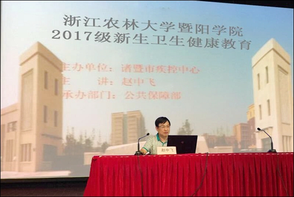 为进一步普及传染病预防知识,提高学生对传染病的预防能力,有效预防与控制传染病的发生与蔓延,确保学生的身心健康,9月12日、13日下午,学院邀请诸暨市疾控中心防疫科科长赵中飞为我院2017级新生开展卫生健康教育。