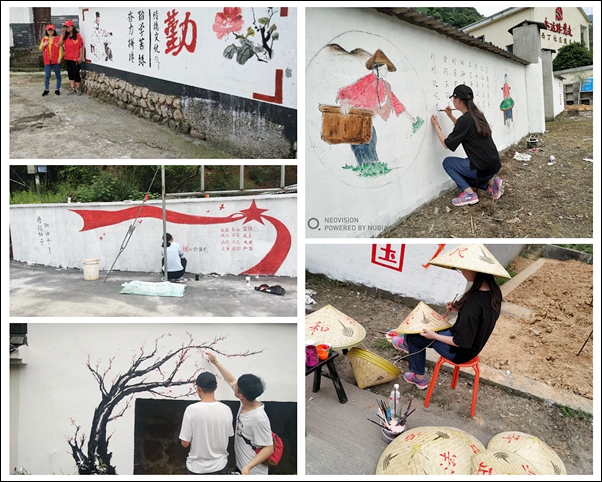 在实践团队指导老师和乡镇干部的带领下,志愿服务团队不惧高温,根据实践要求分成8组,分别来到东白湖镇8个乡村。在村干部的带领下,各小组根据乡村自然风貌和居住环境、建筑风格等,调制颜料、进行墙绘、设计整改方案等。