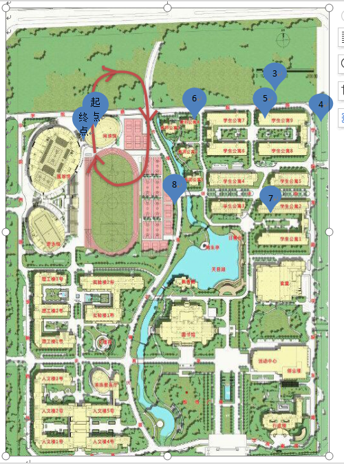 站点三:听歌识曲(小布告栏附近)站点四:你划我猜(两个菜鸟驿站之间)站点五:指压板跳绳(林苑附近)站点六:托乒乓球过障碍(大桥与篮球场之间)站点七:踢毽子(食堂附近)站点八:吹爆气球(甘茶度附近)