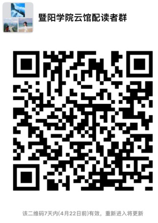 请参加的师生于本周五(4月17日)14:00前扫描下方二维码,加入“云馆配”微信群报名,请备注“姓名+手机号”。