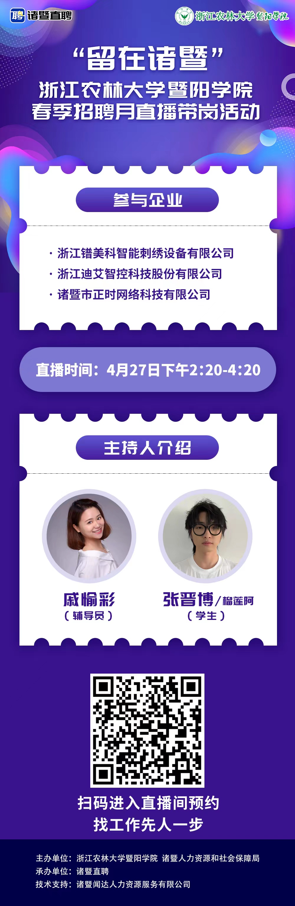 为帮助毕业生进一步拓展就业渠道,满足用人单位对高层次人才的需求,通过多渠道、多途径助力我院毕业生就业,特举办“‘留在诸暨’bat365在线中国官网登录入口春季招聘月”直播带岗活动。