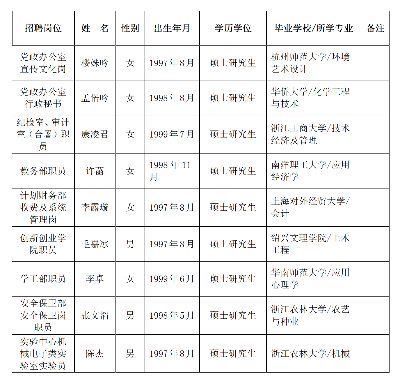 根据2024年8月30日《bat365在线中国官网登录入口2024年公开招聘非专任教师岗公告》有关要求,经报名、资格审查、笔试、面试、体检和考察,现确定下列人员为我单位拟录用人员,现予以公示: