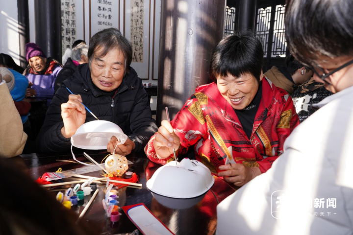 制作过程中,村里老人和支部党员充分发挥想象力和创造力,不一会儿一个个手提灯笼、糖果鞭炮、非遗脸谱跃然于手上。看着自己亲手制作的作品,老人们相互展示、交流、学习,他们的脸上洋溢着笑容。