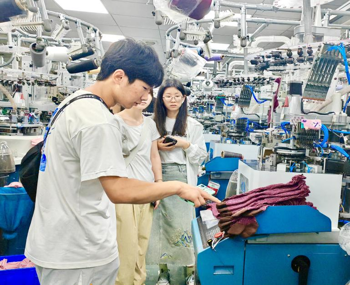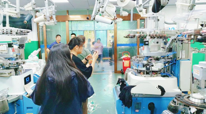 “这智能袜机,简直是行业变革的催化剂!它不仅让织袜速度大幅提升,还能根据消费者的个性化需求定制,既实用又便捷。”大学生刘芮喧说。“诸暨袜业的生产模式已经发生了翻天覆地的变化。过去,制袜厂依赖大量的人力进行生产,现在智能化设备的引入使得生产过程更加高效、精准。此次调研对学生来说是一次极为宝贵的学习与实践机会。”团队指导教师说。