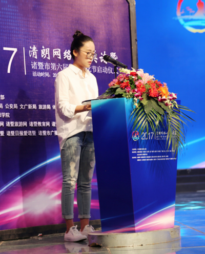 诸暨市网络媒体唯一的党代表、诸暨日报爱诸暨微信公众平台资深编辑费晓笑宣读了《清朗网络好美诸暨——来自西施故里的一份倡议书》。