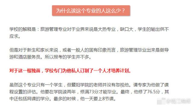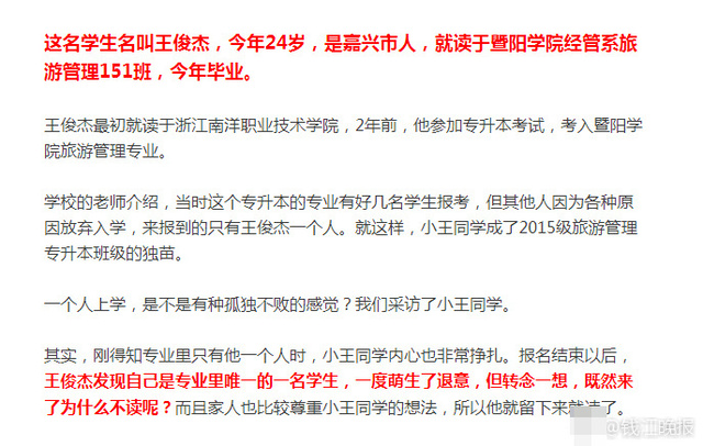 学校的老师介绍,当时这个专升本的专业有好几名学生报考,但其他人因为各种原因放弃入学,来报到的只有王俊杰一个人。就这样,小王同学成了2015级旅游管理专升本班级的独苗。