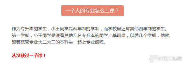 作为专升本的学生,小王同学是两年制的学制,而学校里还有其他四年制的学生。第一学期,小王同学是跟着其他几名专升本的同学上基础课,以后几个学期,他就跟着旅管专业大二大三的本科生一起上专业课程。