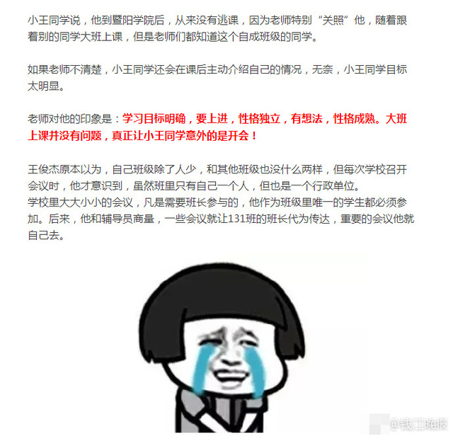 报道称,王俊杰原本以为自己想要逃课是不太现实。但是没想到的是,开会也完全逃不掉。每次学校召开会议时,他才意识到,虽然班里只有自己一个人,但也是一个行政单位。学校里大大小小的会议,凡是需要班长参与的,他作为班级里唯一的学生都必须参加。