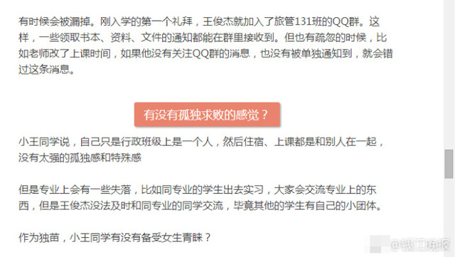 小王同学说,自己只是行政班级上是一个人,然后住宿、上课都是和别人在一起,没有太强的孤独感和特殊感。但是专业上会有一些失落,比如同专业的学生出去实习,大家会交流专业上的东西,但是王俊杰没法及时和同专业的同学交流。
